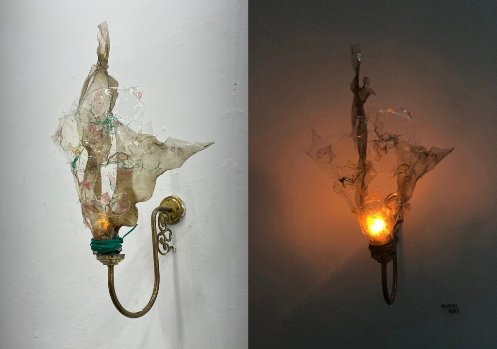 I began experimenting with the creation of 3-dimensional shapes from 2-dimensional paneling. I was very inspired by artist Do Ho Suh’s fabric installations of houses, but I wanted to incorporate bioplastic, discarded materials, or materials found in abundance near me. I liked the precariousness of this composition, and the fact that it was made from ‘trash.’