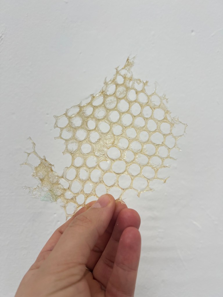 Before 2023, my mediums of choice were ceramics and textiles (the mediums I earned my BA in, in 2018). I pivoted away from these mediums due to my curiosity regarding alternative materials, and due to my own climate anxiety surrounding what it meant to be an artist right now. I didn’t want to start from scratch method-wise, so I experimented with the bioplastic’s ability to be sewn. The gelatin-based bioplastics tolerated this quite well.