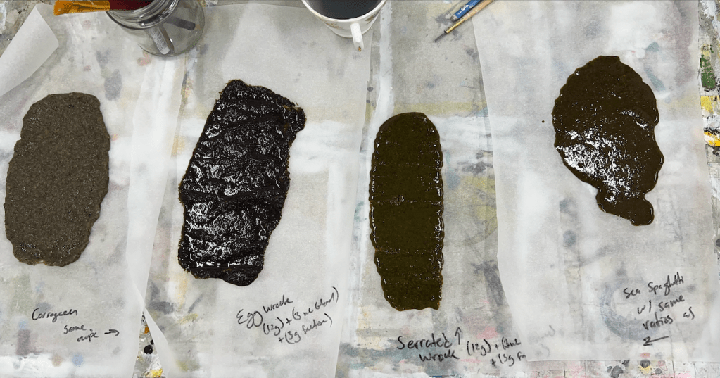 Before settling on gelatin-based bioplastics, I experimented with developing bioplastic recipes sourced entirely from the local seaweed available for foraging. While successful in the sense that it was possible to make a polymer from sea spaghetti, I had immense difficulty keeping the samples from molding (as can be seen here). The drying process for these samples yielded incredibly variable results. Perhaps I will return to this one day.